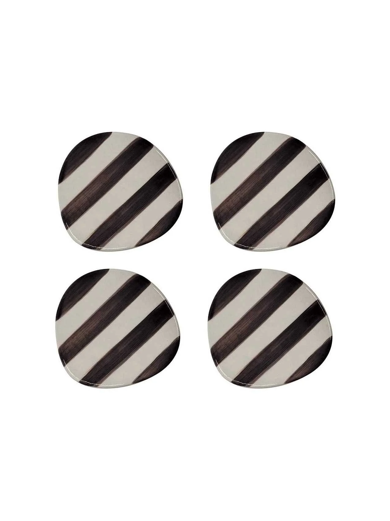 Set of 4 irregularly shaped ceramic coasters with stripes, a contemporary and artisanal touch.