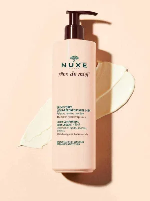 Nuxe Rêve de Miel Ultra-Comforting Body Cream 48H – body cream with honey and botanical oils, specially formulated for dry and sensitive skin. Protects against external aggressors (wind, cold, etc.) and provides long-lasting comfort for 48 hours.