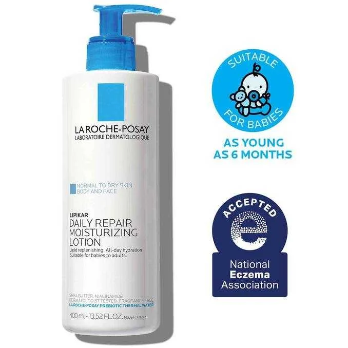 La Roche-Posay Lipikar Body Lotion – body lotion enriched with shea butter, glycerin, and niacinamide. Helps restore essential skin lipids and provides all-day hydration. Approved by the National Eczema Association and suitable for children from 6 months of age.