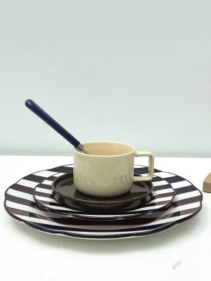 Cup and its two-tone saucer, made of fine, chic earthenware. Each cup has a small white border, contrasting with the handle and the body of the cup. Beige and khaki. Slight color effects may appear, due to the manufacturing technique, adding charm.
