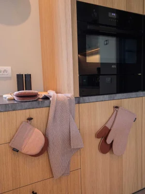 Tiseco Oven Glove RUGA – Set of 2 – 18x32 cm, Cognac – The RUGA series oven gloves combine style and protection in your kitchen. The zigzag knit pattern with silicone dots provides a secure grip and optimal heat resistance. Made from high-quality cotton, they offer comfort and durability. A convenient loop allows for easy storage. Perfectly matches the RUGA series apron and grippers for a complete set.