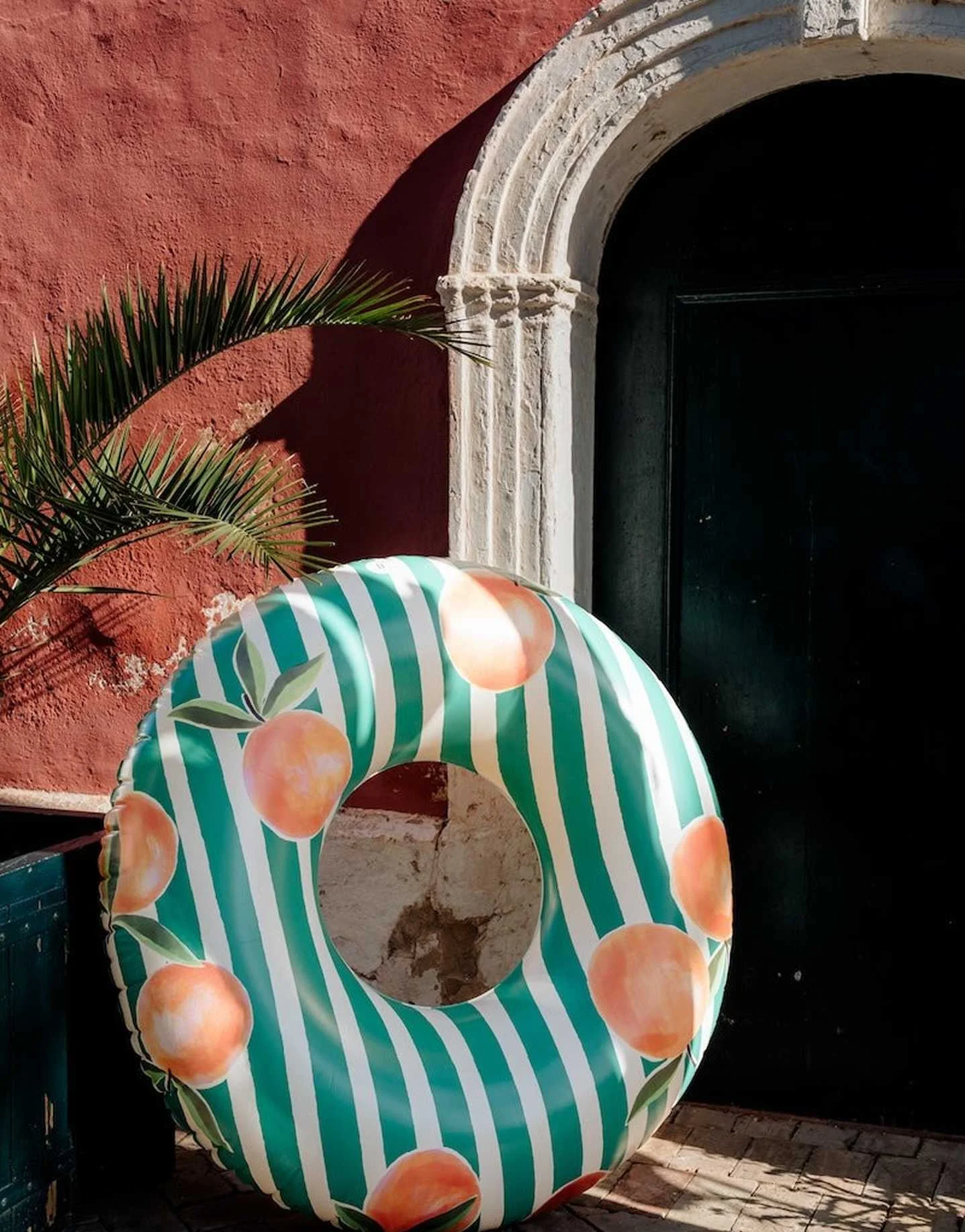 The Nice Fleet XL Cala Figuera Buoy – 120 cm, Green – Large round swim ring with a 1.20 m diameter, decorated with watercolor stripes in terracotta and orange tones. Perfect for fun at the pool, sea, or lake. Printed on both sides.