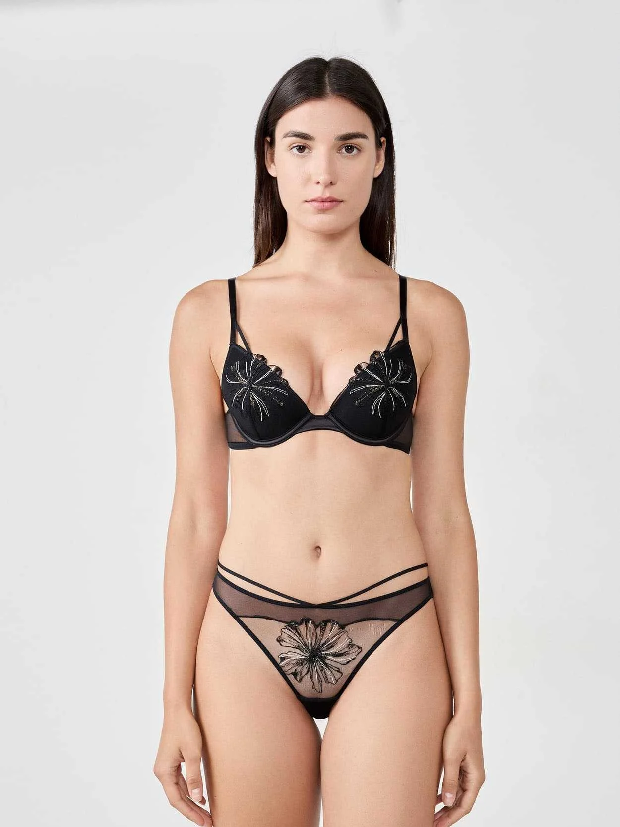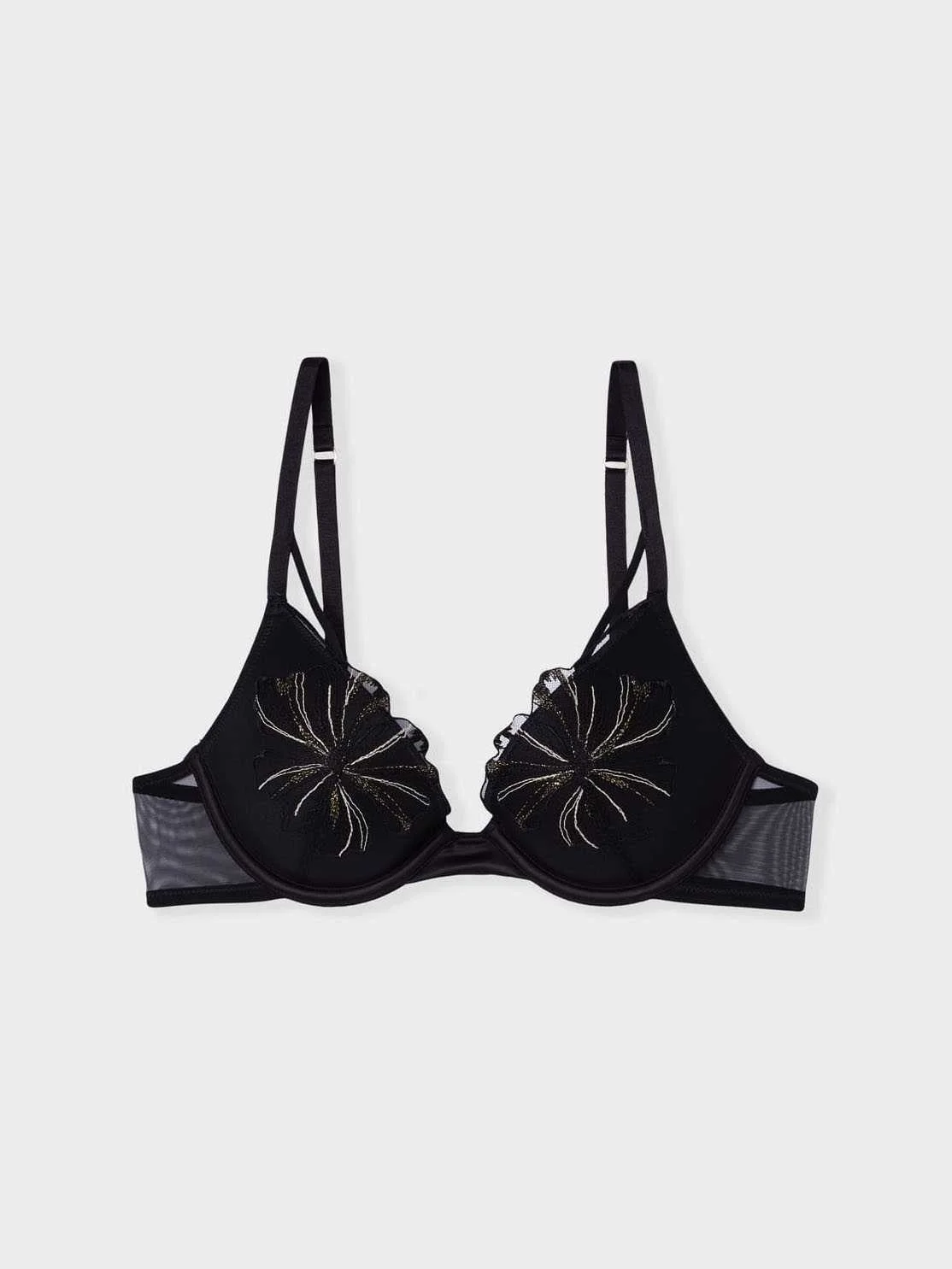 CUP LINING: Polyester - 100%; EMBROIDERY: Polyamide - 55%; Polyester - 44%; Metallised fibres - 1%; TULLE: Polyamide - 88%; Elastane - 12%;