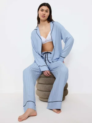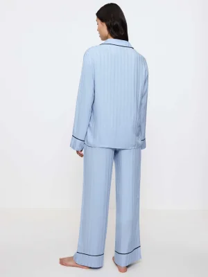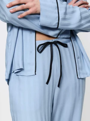 This pyjama set combines comfort with sophistication. The top features a collar and button-down closure, while the full-length pants include convenient side pockets. Sophisticated piping adds a touch of refinement to the overall design. It is crafted from soft, fluid, 100% certified Lenzing EcoVero viscose fabric, featuring a striped shiny and matte Jacquard pattern.