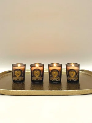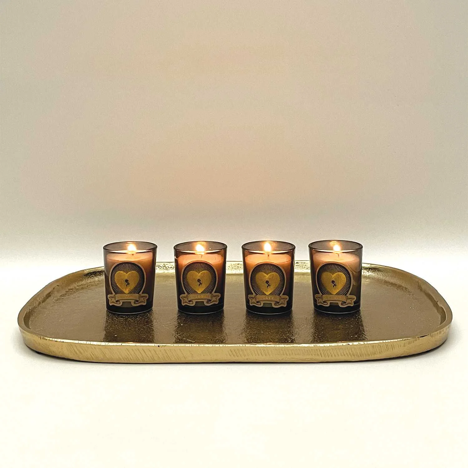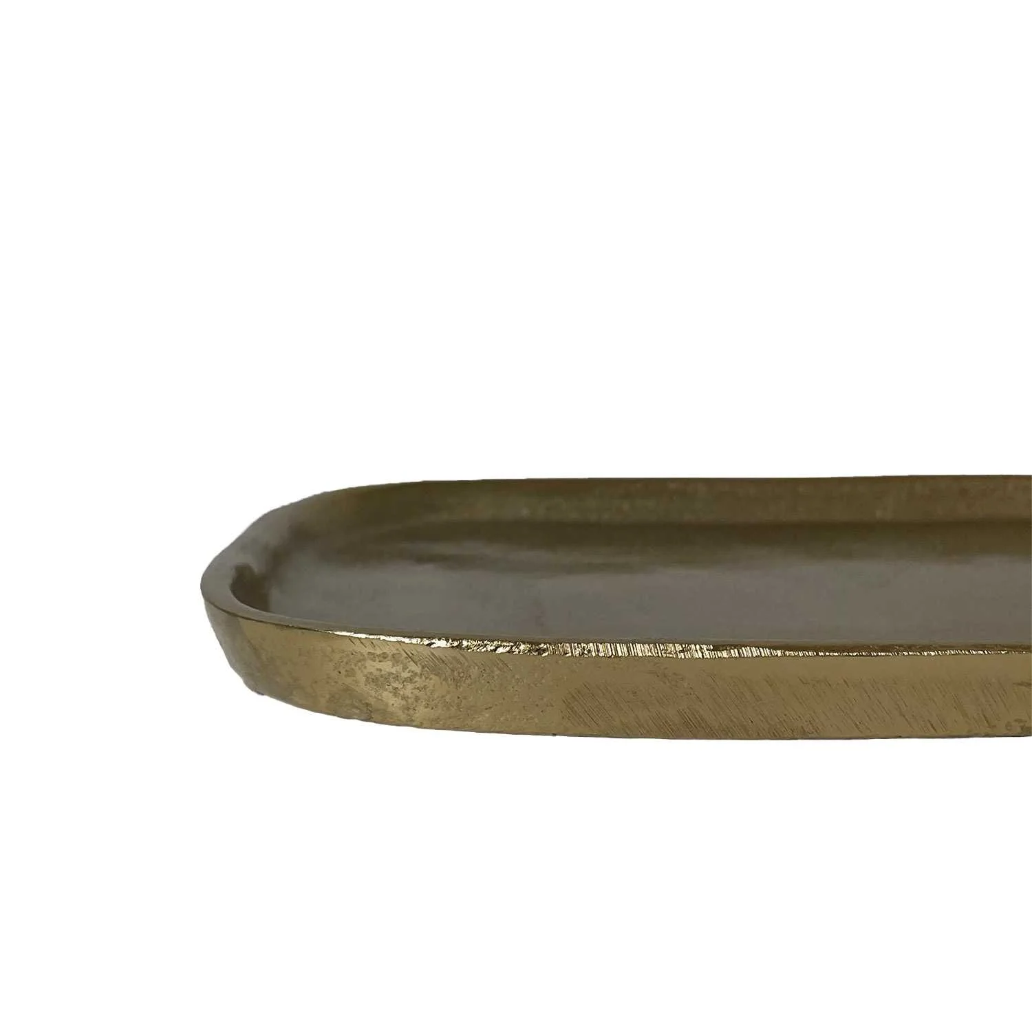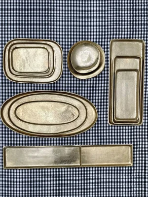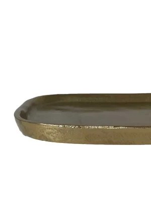 Decorative gold metal tray with a rounded shape.