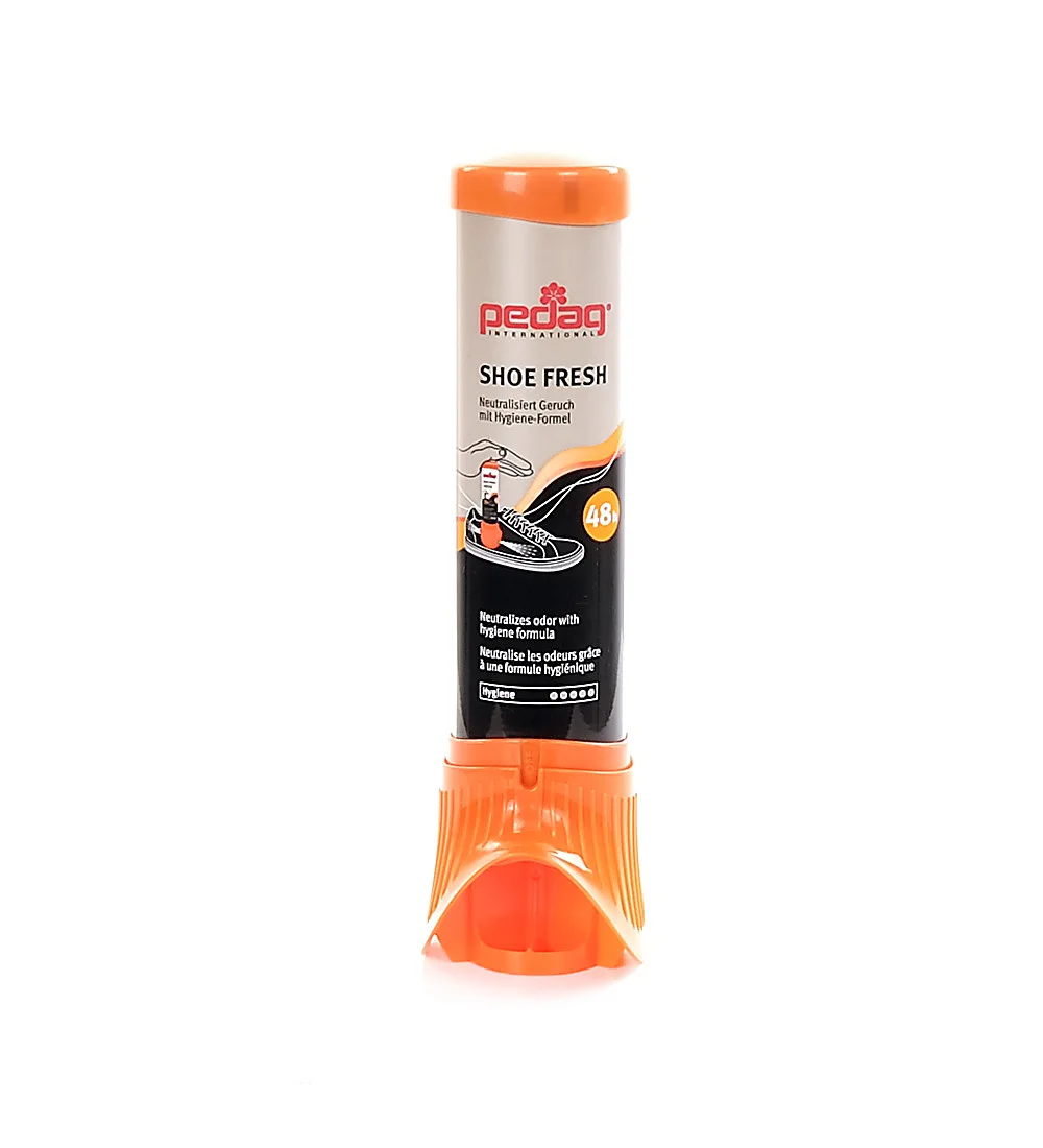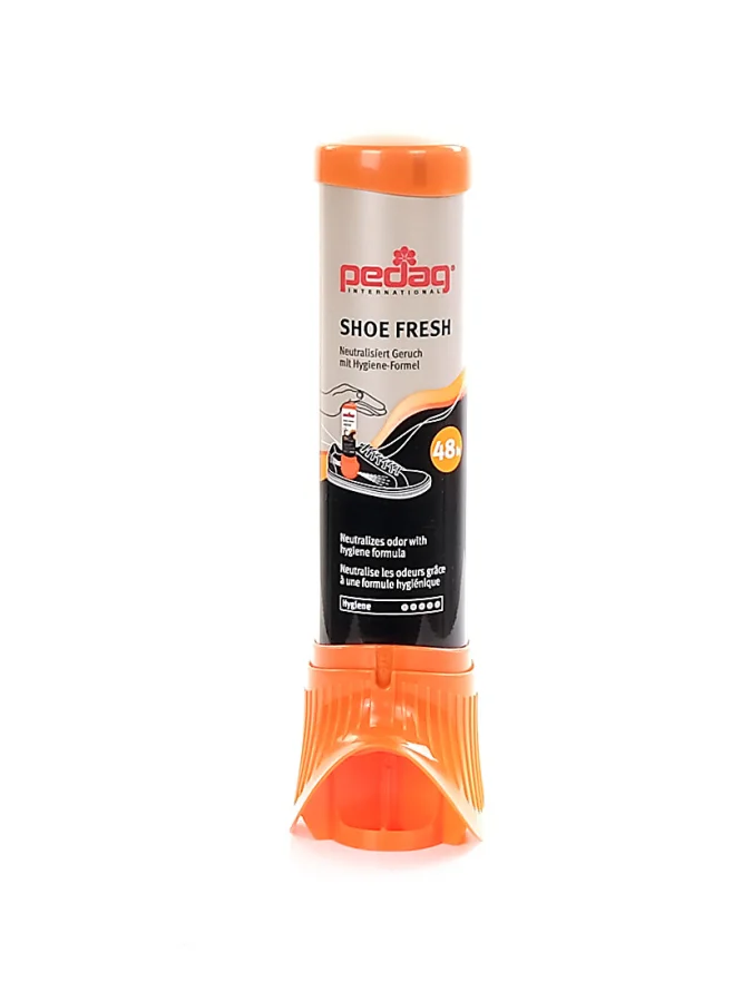 The innovative pedag formula neutralizes unpleasant odors. Intensive freshness – effective for up to 48 hours. Application: Shake before use. Turn upside down. Place the spray nozzle end in the shoe and spray briefly by applying pressure from above. Never point the spray nozzle toward the face.