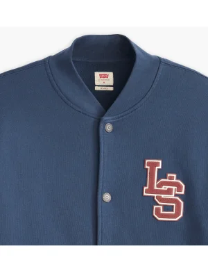 Inspired by bomber and cardigan elements, this design combines a standard fit with button closure and two slanted pockets. The French Terry fabric and varsity-style logo give it a sporty-casual vibe.