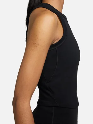 Binding at the neckline and arm openings give the tank a refined finish. A curved hem and elegant seam lines throughout the design keep the look polished, so you can wear it as the first layer—or the only layer.