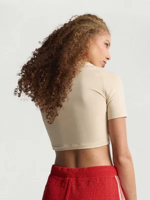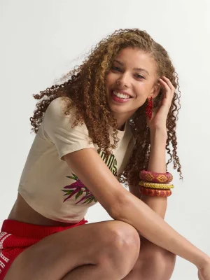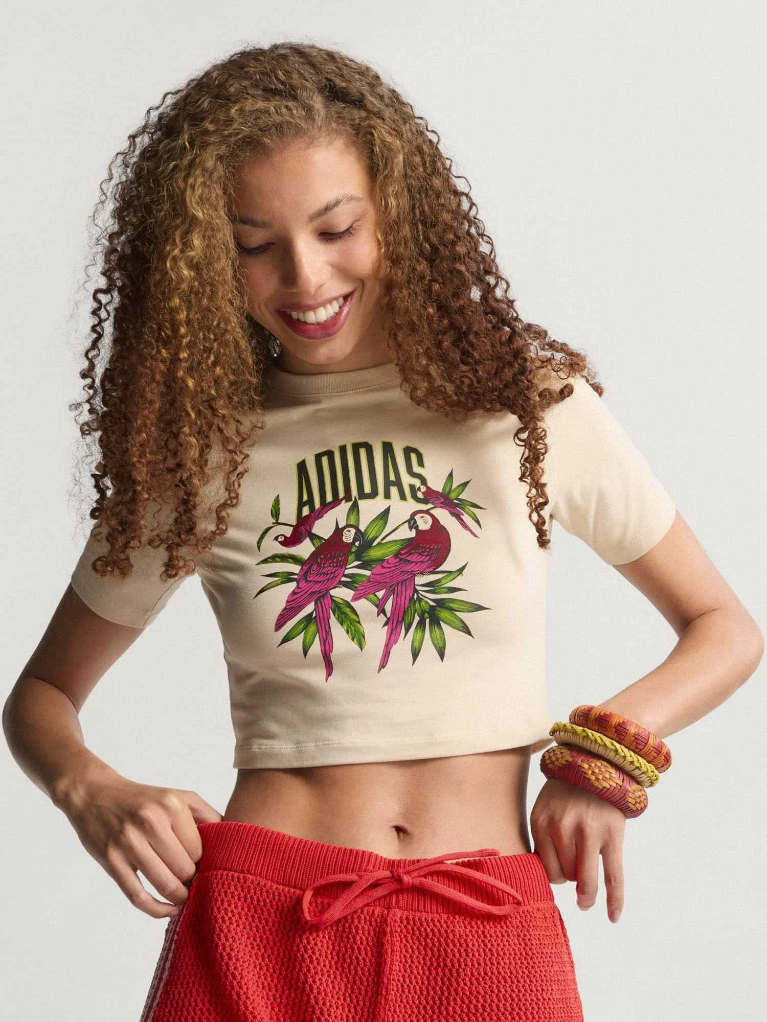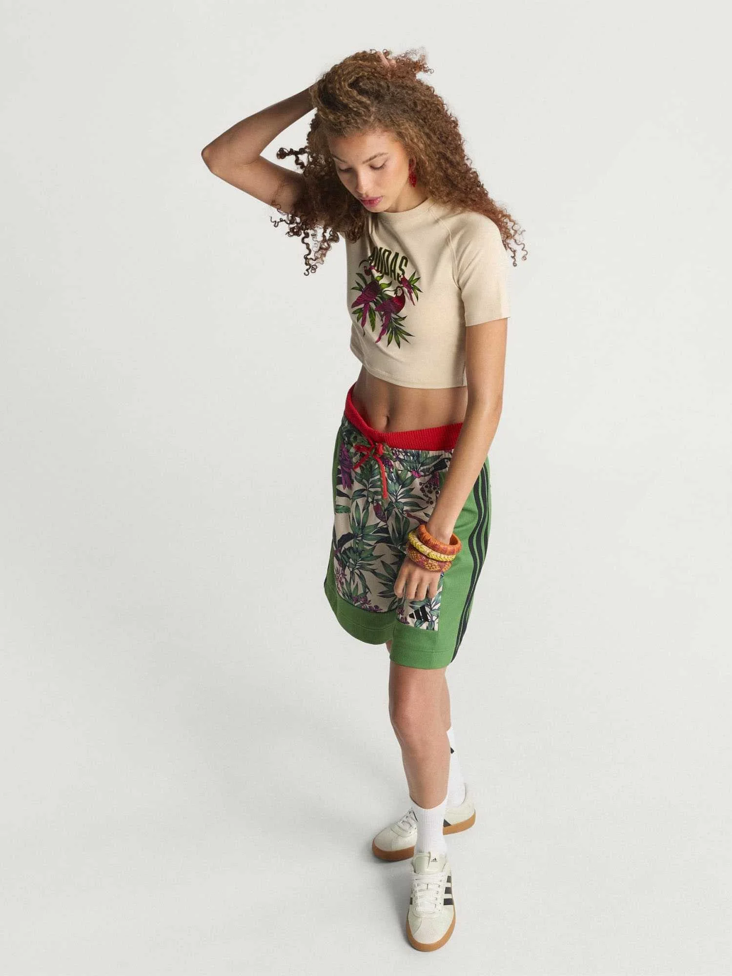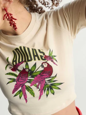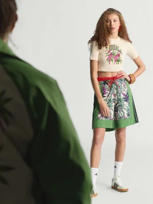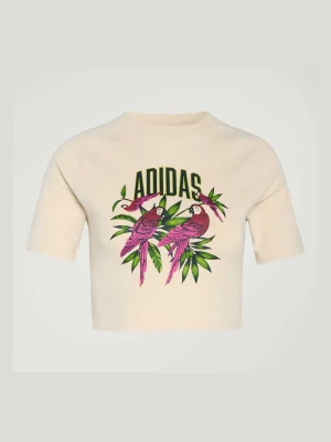 Sport meets art with the adidas x Farm Rio Graphic T-Shirt Cropped. This tee is a vibrant celebration of the colorful murals and dynamic spirit found on city basketball courts, reimagined for sportswear and training.