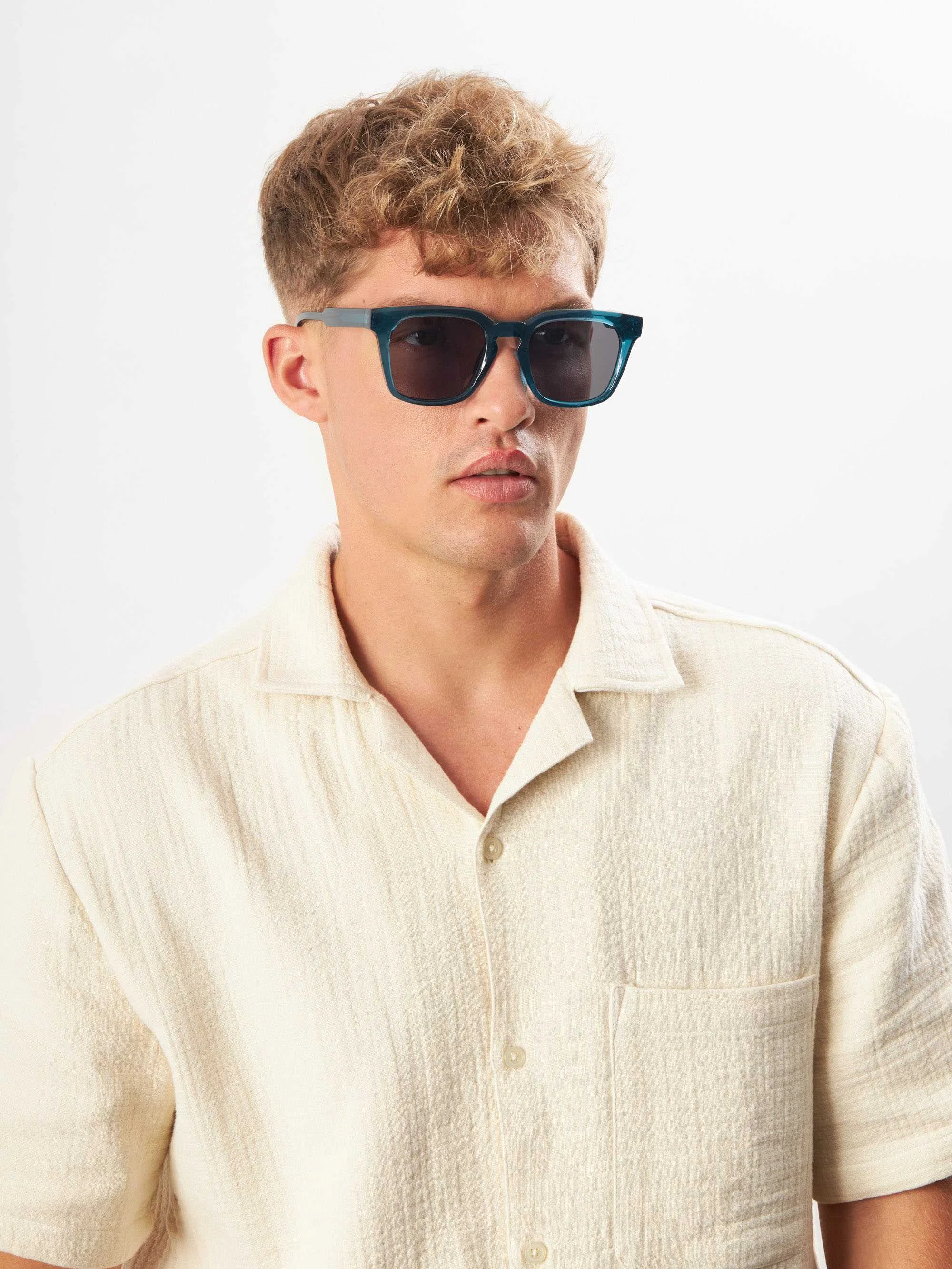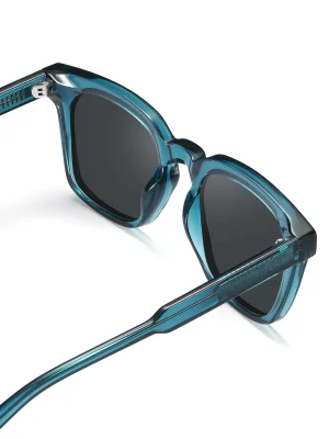 The Martelli Blue sunglasses feature a vibrant, ocean-blue frame with dark lenses. The frame is slightly oversized, providing a trendy and bold look. The design is simple and modern, making these sunglasses perfect for anyone who wants to add a pop of color to their style while staying eco-friendly. The name "Martelli" is Italian for "hammers," symbolising strength and durability.
