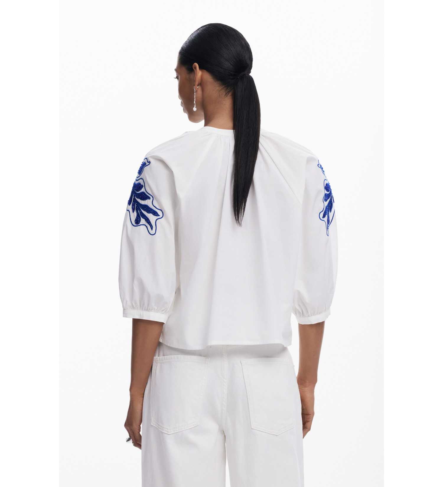 ფრანგული სახელოს ბლუზა ღილებით შესაკრავით და სახელოებზე ერთ ტონში ყვავილის დეტალებით.