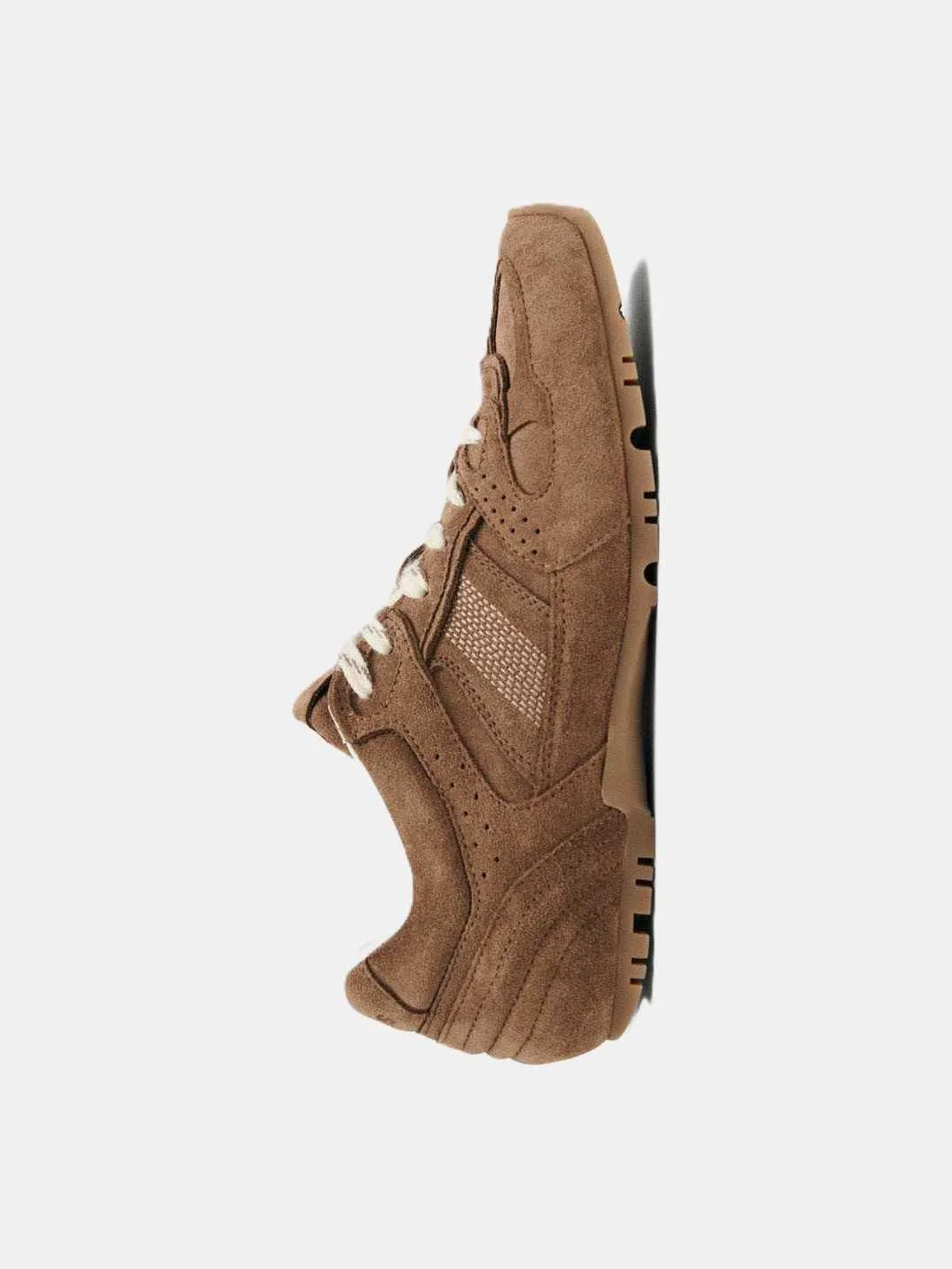 ALOHAS Tb.56 Suede Leather Sneakers – მრავალფენიანი დიზაინის სპორტული ფეხსაცმელი ზამშისგან, გადაჯვარედინებული პანელებით, რომლებიც სიღრმესა და გამორჩეულ იერს მატებს. დაბალყელიანი სილუეტი რეზინის ძირით და მარმარილოსებური კრემისფერი თასმებით, ავთენტური დეტალებით.