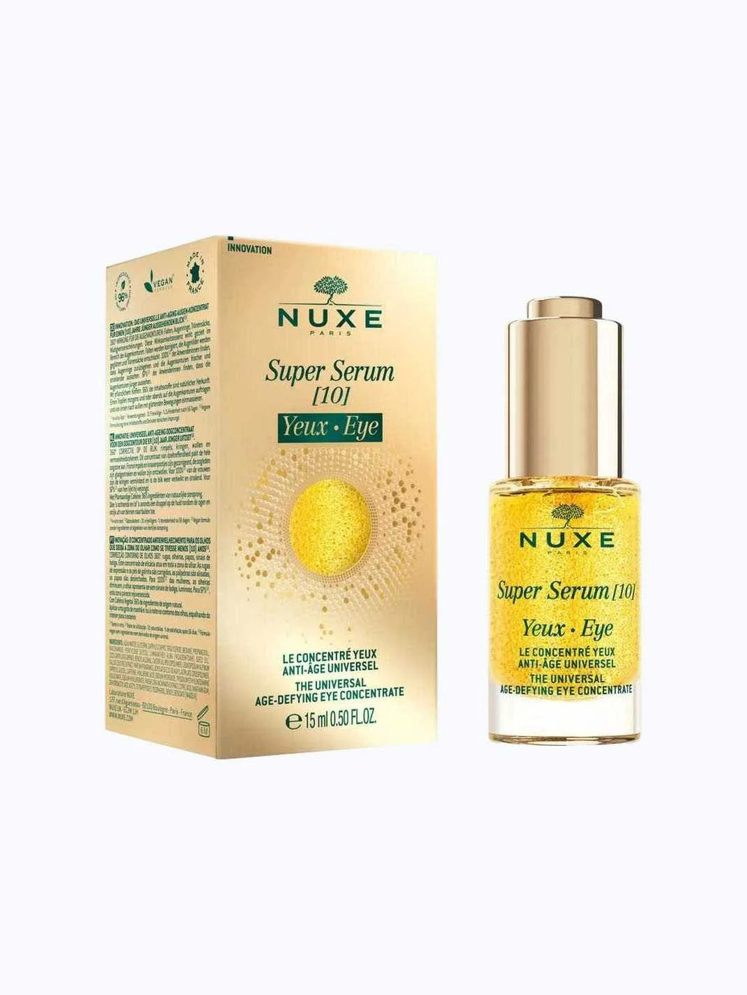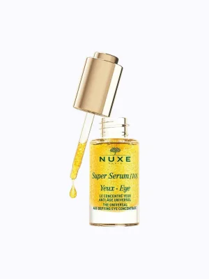 Nuxe Super Serum [10] Eyes – ასაკსაწინააღმდეგო კონცენტრატი თვალის კონტურისთვის, რომელიც ეფექტურად ამცირებს ნაოჭებს, მუქ წრეებს, შეშუპებასა და დაღლილობის ნიშნებს. ასწორებს ქუთუთოებს, ამცირებს ნაოჭებს შუბლის არეში, ანიჭებს თვალებს განახლებულ, ნათელ და დასვენებულ იერს.