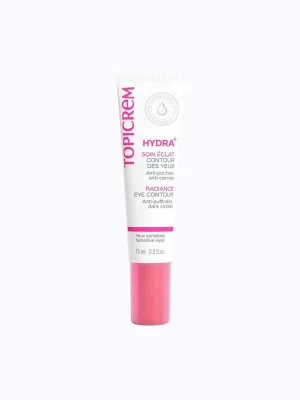 Topicrem Hydra+ Radiance Eye Contour – 24-საათიანი დამატენიანებელი მოვლის საშუალება სენსიტიური თვალების კონტურისთვის. გამდიდრებულია ბიო-აქტიური წყლითა და კოფეინით, რაც უზრუნველყოფს ანტი-საქვეედე, ანტი-მუქი წრეებისა და ანტი-დაბინძურების მოქმედებას.