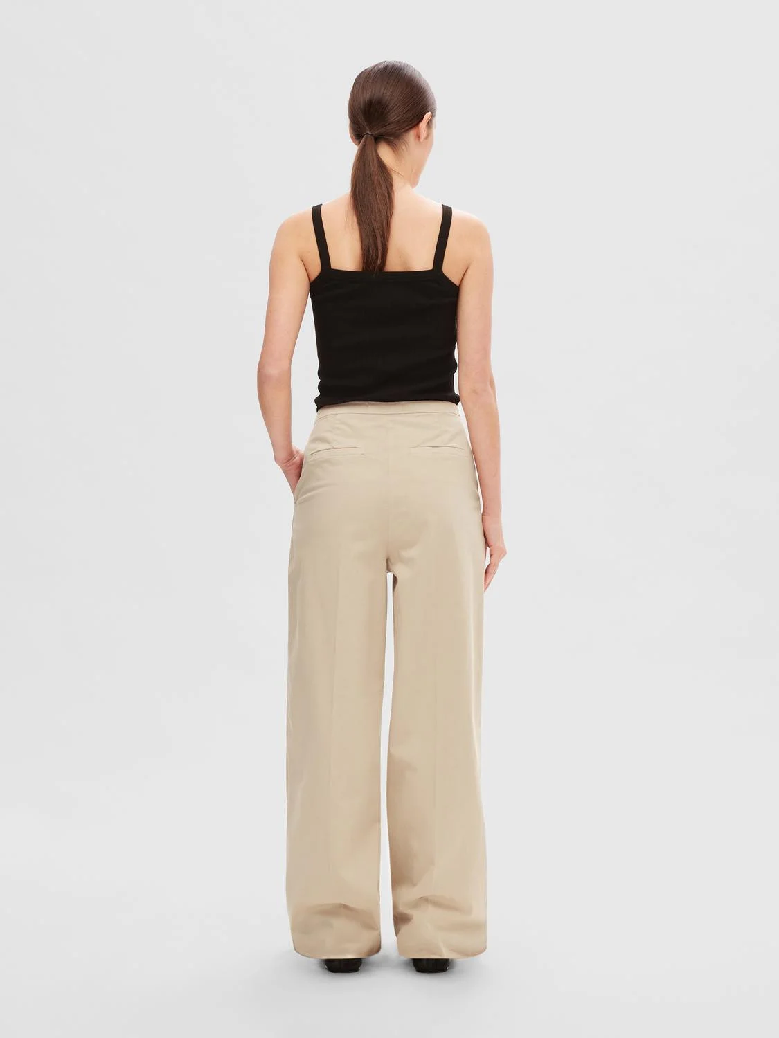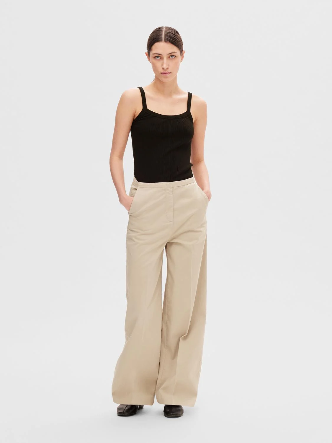 Selected Tank Top – მარტივი და ელეგანტური ტოპი ყოველდღიური გარდერობისთვის. მჭიდრო მორგება და ღრმა U-ამოჭრა ხაზს უსვამს სხეულს, ხოლო რბილი ქსოვილი უზრუნველყოფს კომფორტს და თავისუფალ მოძრაობას მთელი დღის განმავლობაში.
