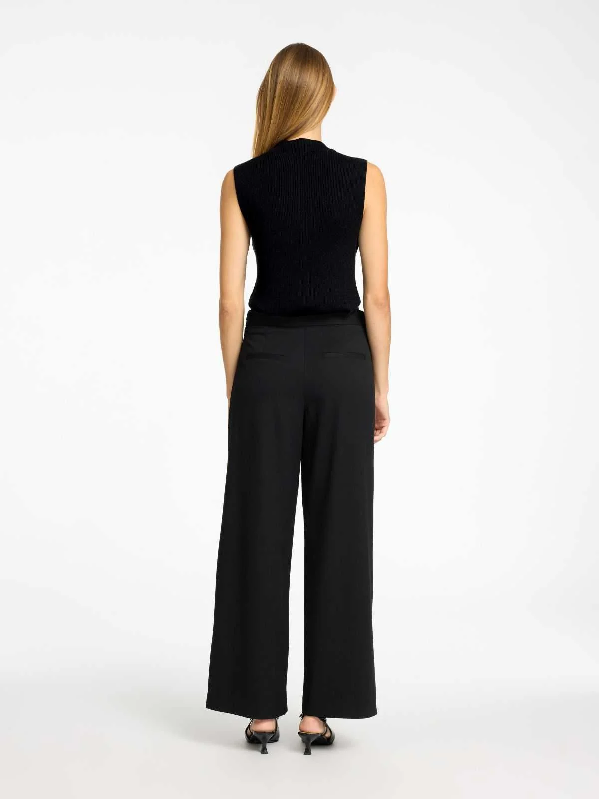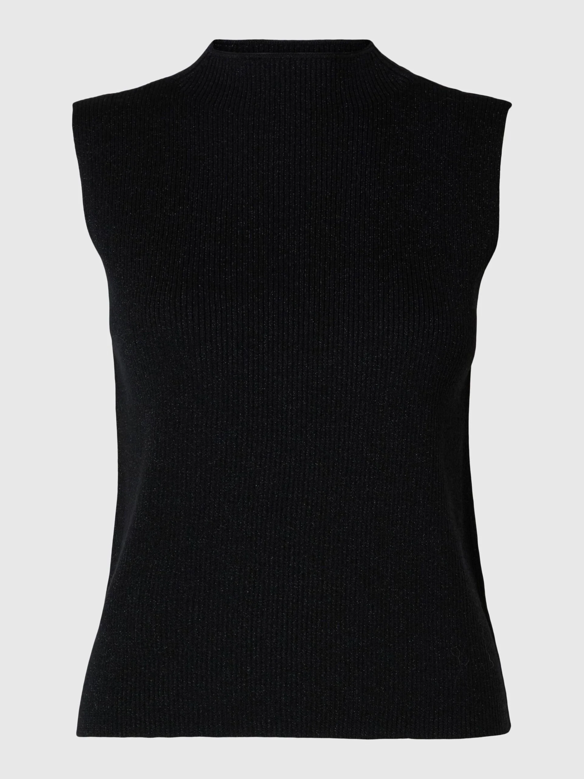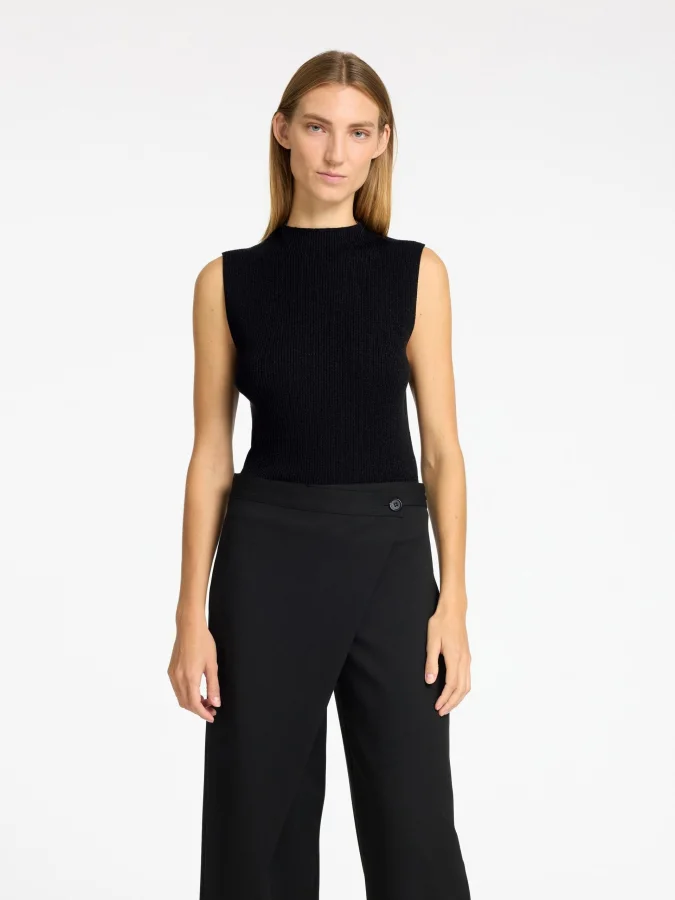Selected Knitted Top – ელეგანტური ნაქსოვი ტოპი მაღალი საყელოთი და სახელოების გარეშე დიზაინით. თავისუფალი მორგება და ნაზი ბზინვარე დეტალები ქმნის დახვეწილ იერს, რომელიც შესაფერისია როგორც ყოველდღიური, ისე საღამოს ჩაცმულობისთვის.