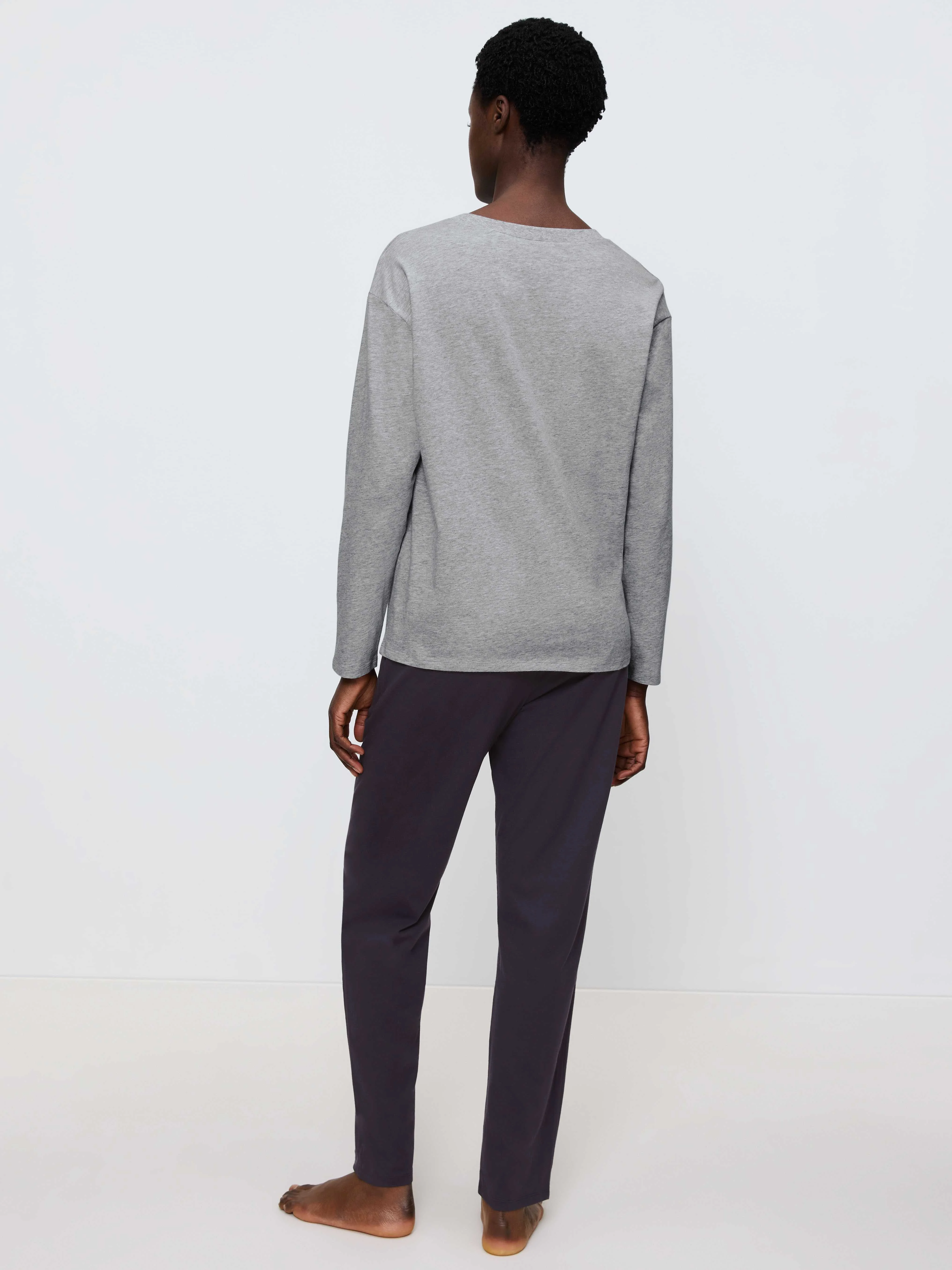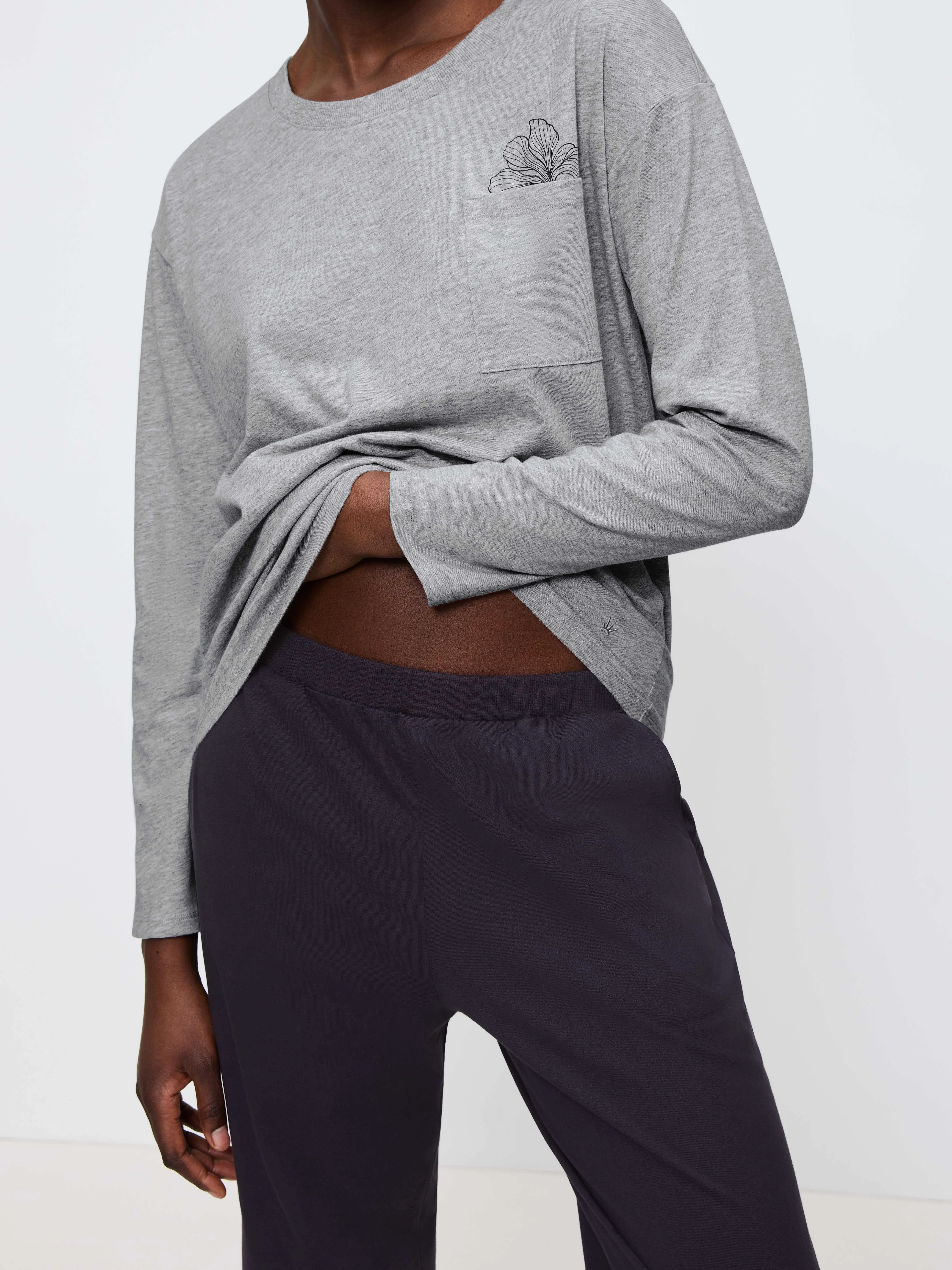 ეს გრძელმკლავიანი ჯერსის პიჟამის კომპლექტი აერთიანებს კომფორტსა და სტილს. დაქარგული მრგვალი საყელო, მკერდის ჯიბე და დაშვებული მხრები ქმნის თავისუფალ, თანამედროვე ვიზუალს და უზრუნველყოფს კომფორტულ მორგებას.