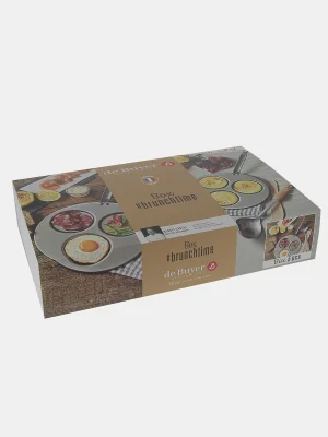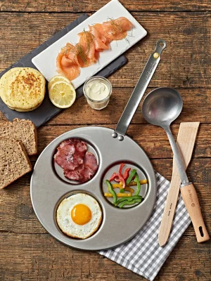 MINERAL B-ის ფოლადის კრეპის ტაფა — ფუტკრის ცვილის საფარით და ფოლადის სახელურით; თითოეული კრეპის დიამეტრი: 10 სმ
