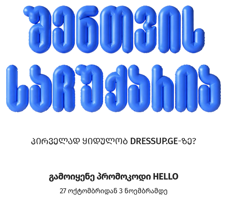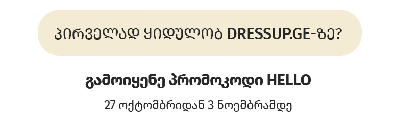 შეიძინე შენი პირველი პროდუქტი Dressup.ge-ზე და მიიღე 100₾ ფასდაკლება, თუ შეკვეთის ჯამური ღირებულება შეადგენს 200₾-ს ან მეტს.