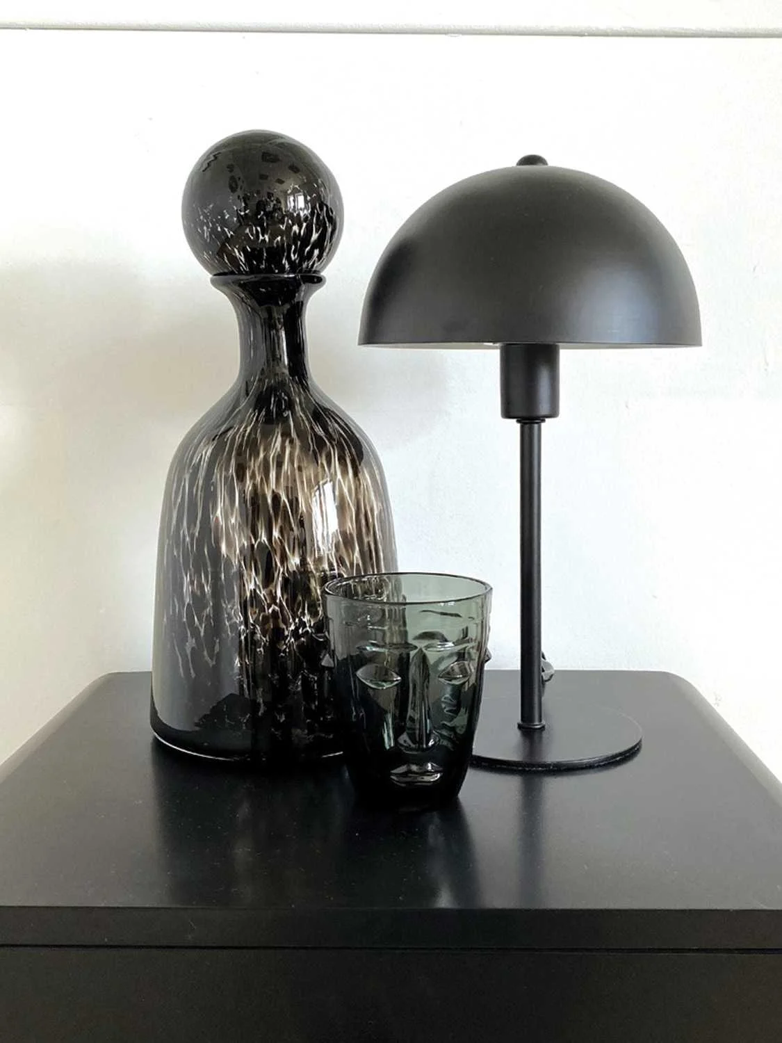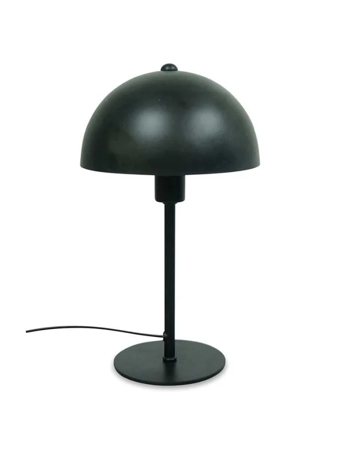 მაგიდის სანათი, რომელიც შედგება გუმბათის, საყრდენისა და ქვედა ბაზისგან, შავი მეტალის მასალით.