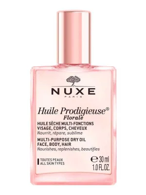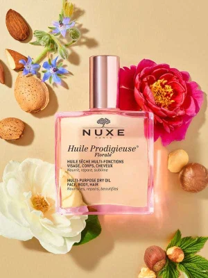 Nuxe Huile Prodigieuse Florale – მრავალფუნქციური საშუალება სახის, სხეულის და თმისთვის, რომელიც ინტენსიურად კვებავს, აღადგენს და იცავს. ხელს უწყობს დეჰიდრატაციის, სიმშრალისა და სტრიების შემცირებას, ხოლო თმას სძენს ელასტიურობასა და ჯანსაღ ბზინვარებას.