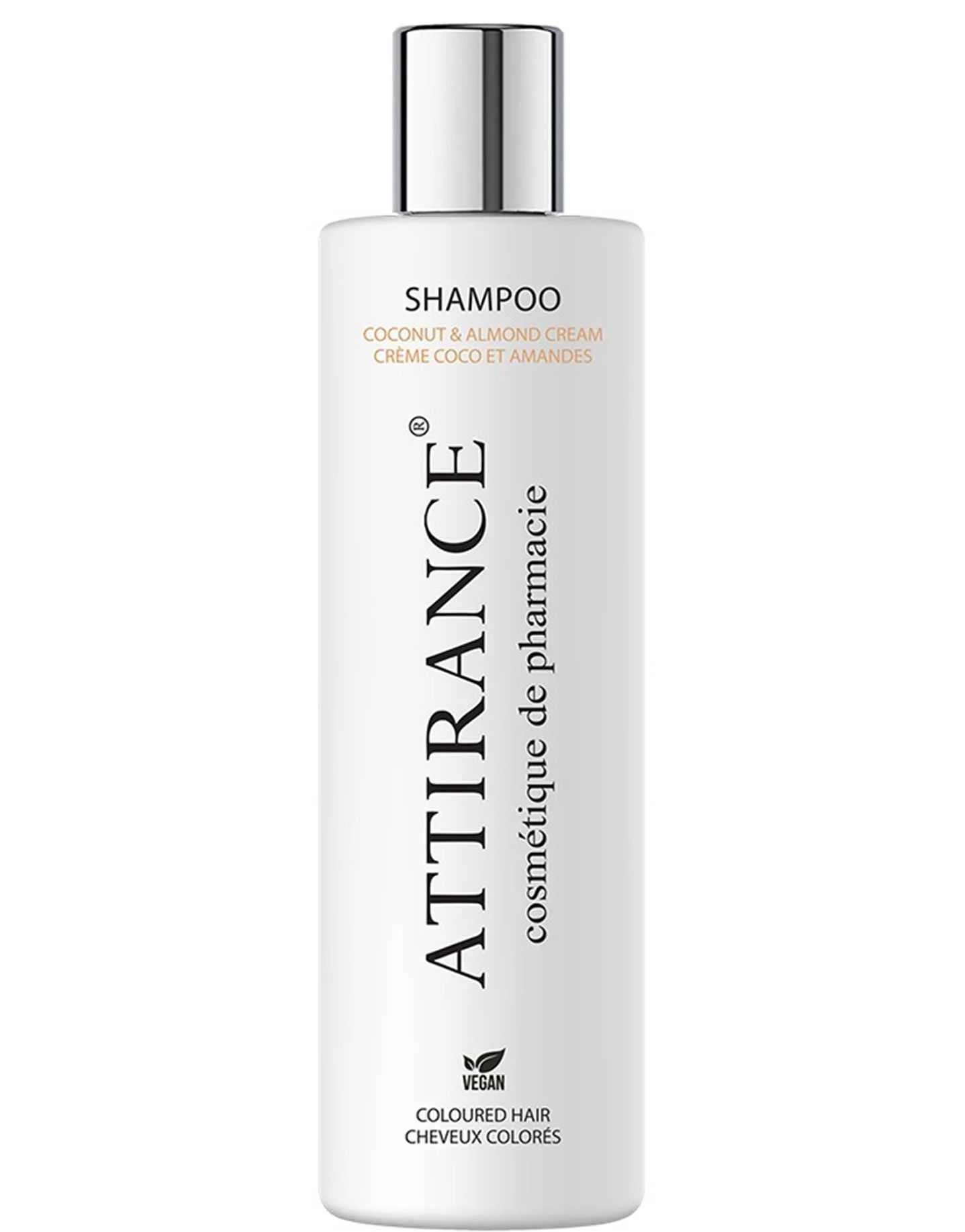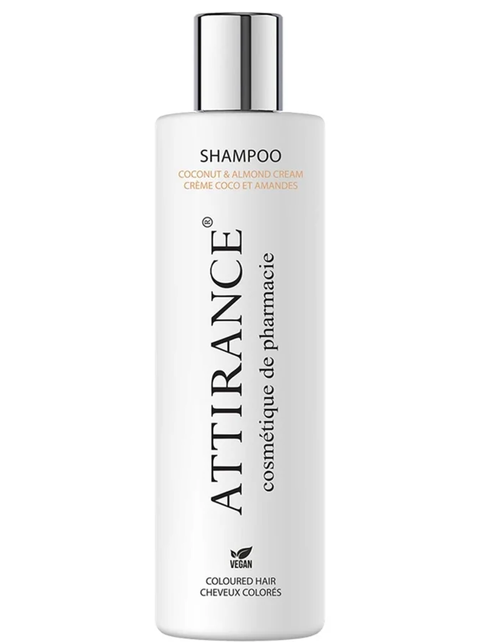 ATTIRANCE ვეგანური შამპური სერთიფიცირებული ქოქოსის და ნუშის ზეთით – ეფექტურად წმენდს თავის კანსა და თმას. ქოქოსის ზეთი ატენიანებს, იცავს და აღადგენს თმას ზედმეტად დამძიმების გარეშე, ხოლო ნუში მატებს სირბილეს და ნაზ შეგრძნებას.