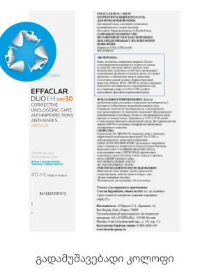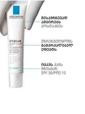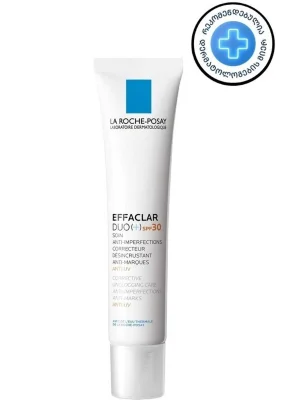 La Roche-Posay Effaclar Duo+ – ამცირებს ნაკლოვანებებს და ატენიანებს კანს, უზრუნველყოფს უფრო სუფთა კანს 4 კვირაში. აღჭურვილია ფართო სპექტრის UVA, UVB და გარემოს დაბინძურებისგან დაცვის სისტემით. სპეციალურად შექმნილია ცხიმიანი, არასრულყოფილებისკენ და აკნესკენ მიდრეკილი კანისთვის მოზრდილებსა და თინეიჯერებში. ორმაგი მოქმედების ყოველდღიური გელი-დამატენიანებელი ამცირებს ლაქებსა და შავ წერტილებს, აკონტროლებს პრიალს და ხსნის ანთებას, რათა თავიდან აიცილოს წითელი და ყავისფერი ნიშნები, რომლებიც ლაქების შემდეგ რჩება. უზრუნველყოფს დაუყოვნებელ დაცვას UVA და UVB სხივებისგან, ასევე იცავს კანს დაბინძურებისა და ინფრაწითელი სხივების ზემოქმედებისგან. ატენიანებს კანს 24 საათის განმავლობაში და ხელს უწყობს მის გლუვ იერს. შესაფერისია სენსიტიური კანისთვისაც.