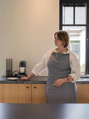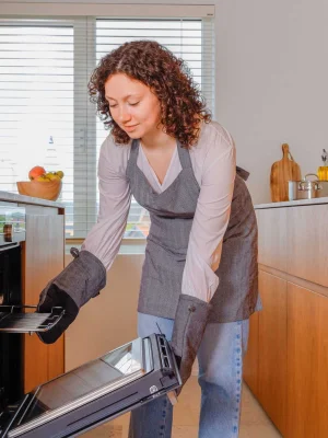 Tiseco Apron RUGA – 75x80 cm, Black – RUGA სერიის წინსაფარი გამოირჩევა დახვეწილი „ელვისებური“ ნაქსოვით, რაც მას თანამედროვე და სტილურ იერს ანიჭებს. რეგულირებადი კისრის თასმა კომფორტს და იდეალურ მორგებას უზრუნველყოფს, ხოლო პრაქტიკული წინა ჯიბე საჭირო ნივთების მოსათავსებლად არის იდეალური. სრულყოფილ იერს ქმნის შესაბამისი ღუმელის ხელთათმანებითა და გრიპერებით.